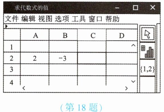 18. (★★)如图是某软件的表格区,字母$A,B,C,…$表示列,数字$1,2,3,…$表示行. 列和行相交的部分叫作单元格,用列号和行号表示,如 B2 表示 B 列第 2 行的单元格. 用该软件的表格区可以进行数值计算. 例如,计算当$x = 2,y = -3时式子3x - y^{2}$的值,分别在单元格 A2 和 B2 中输入 2 和$-3$(即$x和y$的值),在 C2 中输入“$=3*A2 - B2^2$”(“$*$”表示乘号,“$^$”表示乘方),电脑会把计算结果自动填入 C2. 则 C2 中的数值应是