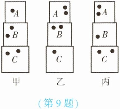 9. (★★)为了提高学生体育锻炼的意识,七年级(1)班进行了一次投掷实心球的测试,老师在操场上画出了$A$、$B$、$C$三个区域,每人投掷$5$次,实心球落在各个区域的分值各不相同,其中落在$C区域得3$分. 甲、乙、丙三位同学投掷后其落点如图所示. 已知甲同学的得分是$19$分. 请解答下列问题:
