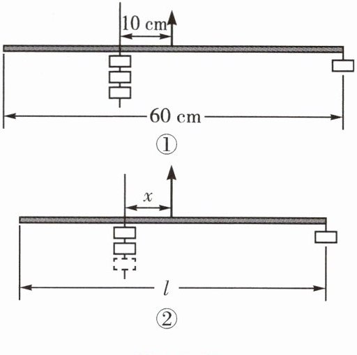 (2)如图②,在木杆右端挂一重物,支点左边挂$n$个重物,并使左右平衡. 设木杆长为$l\ cm$,支点到木杆左边挂重物处的距离为$x\ cm$,把$n$,$l$作为已知数,列出关于$x$的一元一次方程.