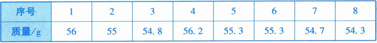 |质量/g|56|55|54.8|56.2|55.3|55.3|54.7|54.3|