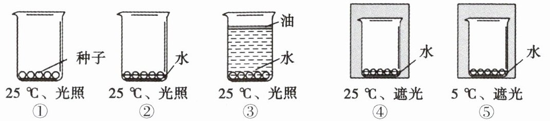 7. 探究种子萌发的外界条件的实验装置如图 5-1-9 所示,在每个烧杯中放入 10 粒干燥的种子,并为这些烧杯提供相应的环境条件。如果只探究光照条件对种子萌发的影响,那么选择的装置是【