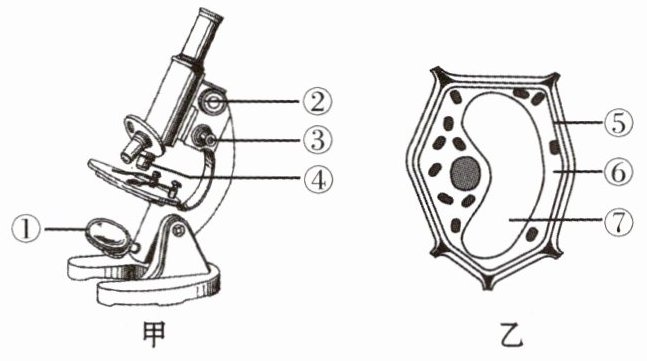 1. (2024·河南)人们对微观世界的认识离不开显微镜。光学显微镜的结构如图阶(二)-1 甲所示,植物细胞的结构如图阶(二)-1 乙所示。下列相关叙述正确的是【
