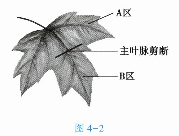 2. 图4-2是将绿色植物在黑暗中放置24小时后,选择一片绿叶,把主叶脉剪断。然后将植株放在阳光下照射2~4小时,经检验发现叶片的上半部分(B区)不能正常制造淀粉。由此可以证明光合作用的原料之一是【