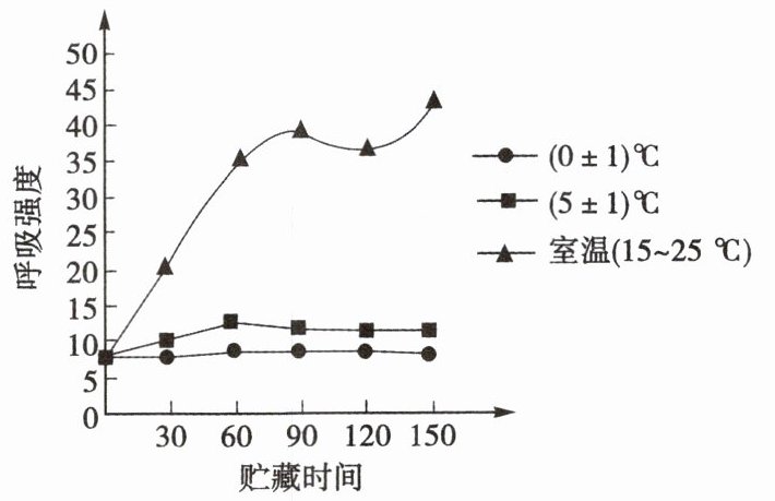 3. (2023·呼伦贝尔)新鲜的核桃营养成分损失较少,口味香醇,但不宜保存。图阶(四)-3 是不同贮藏温度条件下新鲜核桃呼吸强度与贮藏时间的关系。下列说法正确的是【