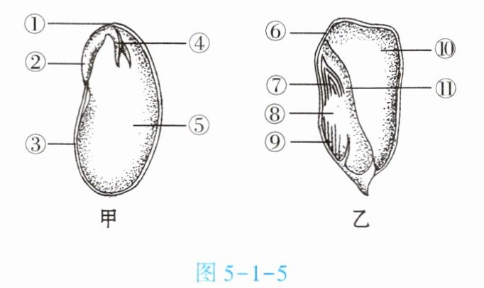 13. 某同学观察完菜豆种子和玉米种子后绘制了图5-1-5,甲为菜豆种子结构图,乙为玉米种子结构图。回答下列问题。