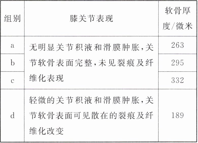 ③8周后,观察大鼠的膝关节,测量其关节软骨的厚度,结果如下表。