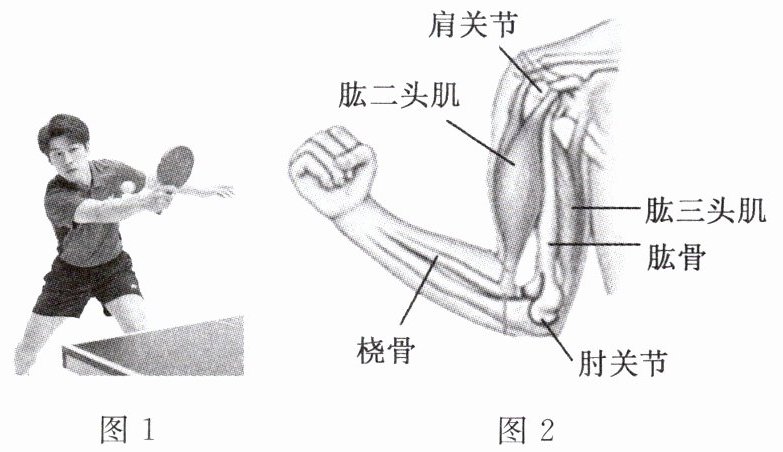 (1)图1表示挥拍接球时人体由伸肘变为屈肘的动作。据图2所示,该动作的完成依赖______的收缩,牵动肱骨绕______关节运动。骨骼肌两端的肌腱附着在______(填“相同”或“不同”)的骨上,收缩产生动力。该运动的能量供应,有赖于消化系统、______系统、______系统等系统的配合。
