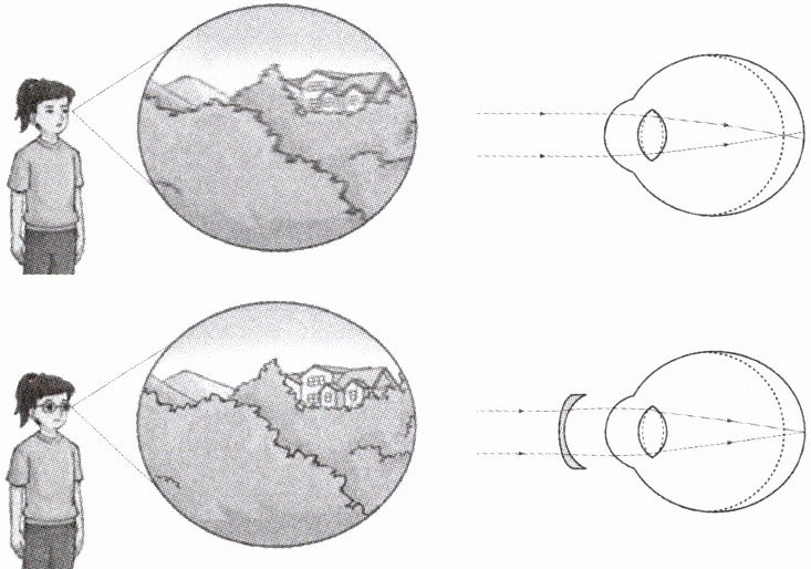 【提示】若眼球前后径过长,或角膜、晶状体曲度过大且不易恢复原状,使远处物体的物像落在视网膜的前方,则形成近视,可配戴凹透镜矫正;若眼球过短、角膜或晶状体曲度过小、衰老时的生理性或病理性变化,使近处物体的物像落在视网膜的后方,则形成远视,可配戴凸透镜矫正。