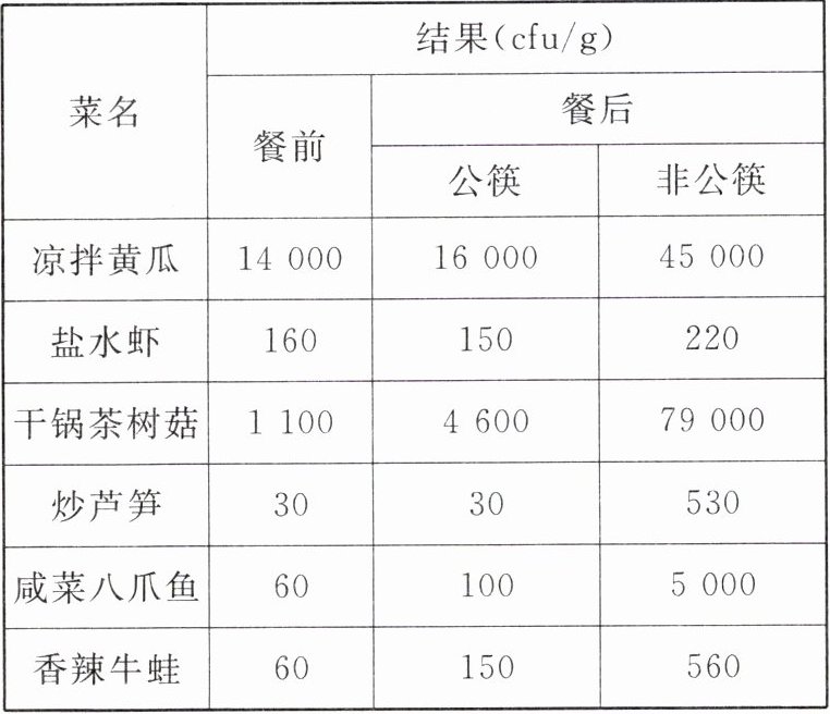 步骤3:分别测试采集的样本中,餐前、使用公筷和不使用公筷用餐之后的菌落数。测试结果如下表(cfu/g是指每克待检样品培养出的菌落形成单位)。
