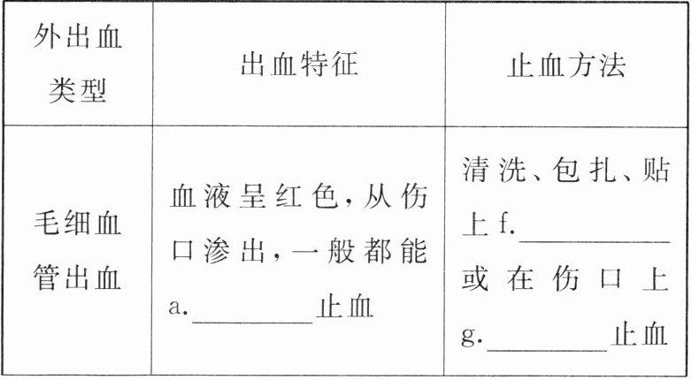 |毛细血管出血|血液呈红色,从伤口渗出,一般都能a.____止血|清洗、包扎、贴上f.____或在伤口上g.____止血|
