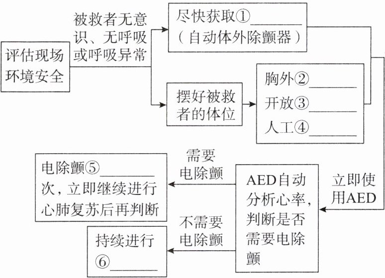 2. 心肺复苏:当有人因煤气中毒或触电等意外事故发生心搏骤停、呼吸骤停时,要立即关闭____或____,确认现场环境安全,同时还要对被救者进行____,流程如下。
