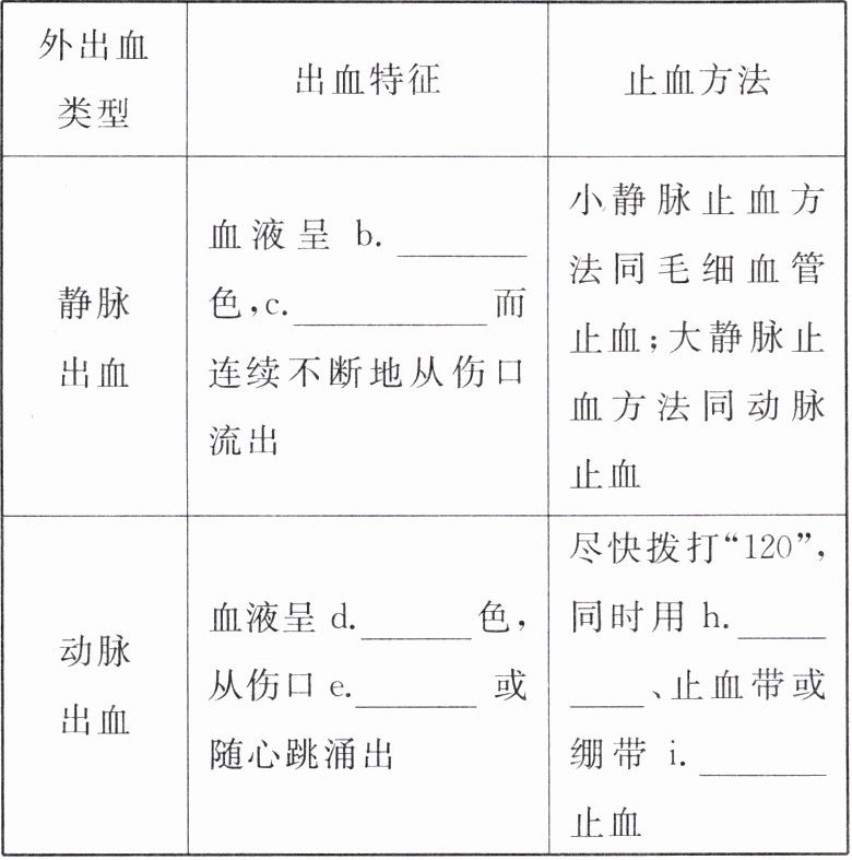 |动脉出血|血液呈d.____色,从伤口e.____或随心跳涌出|尽快拨打“120”,同时用h.____、止血带或绷带i.____止血|