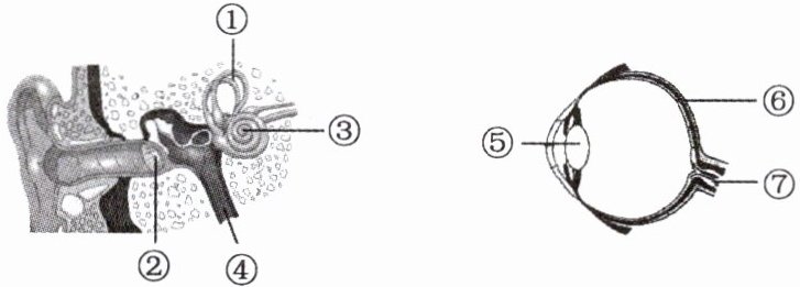 17. 人体通过眼、耳等器官从外界获取的信息主要靠神经系统传递,各项生命活动都离不开神经系统的调节。下面是人的眼球及耳的结构示意图,请回答下列问题。