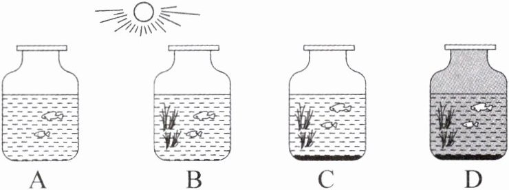 (1)生物圈 (2)阳光 (3)分解者 (4)氧气 (5)C和D 【提示】(4)A装置与B装置对照,变量是水藻,水藻在光下可以进行光合作用,为小鱼提供充足的氧气,因此B装置中小鱼的生存时间比A长。