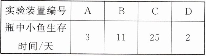 | 瓶中小鱼生存时间/天 | 3 | 11 | 25 | 2 |
