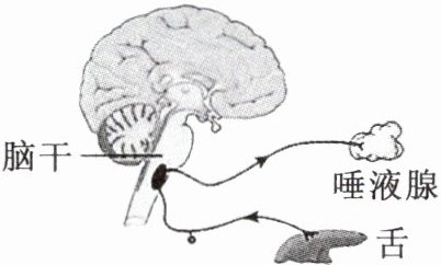 C 【提示】反射是指机体通过神经系统,对外界或内部的各种刺激所作出的有规律的反应。根据反射形成的过程可将其分为两类:非条件反射和条件反射。反射的结构基础是反射弧,包括感受器、传入神经、神经中枢、传出神经、效应器五部分,A项正确;人吃酸梅时,唾液分泌量增加,是人生来就有的非条件反射,据图可知,控制该反射的神经中枢在脑干,B项正确;吃酸梅时,唾液分泌量增加,是简单的反射,是人体在正常情况下遇到刺激时会作出的反应,不需要先经过大脑的分析和判断,C项错误;效应器由传出神经的神经末梢与它支配的肌肉或腺体组成,据图可知此反射的效应器是唾液腺,D项正确。