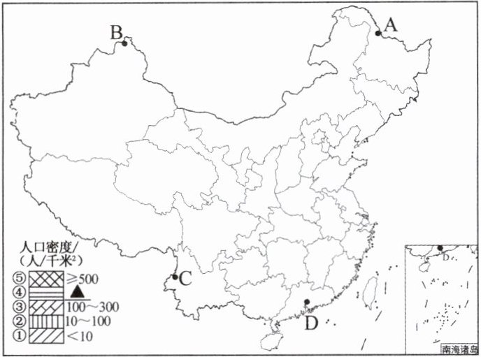 (4)完成我国人口分布图的绘制后,确定我国人口地理分界线。在图示A、B、C、D四个点中选择合适的两个点连线,画出我国人口地理分界线。由图可知,我国的人口分布特点是