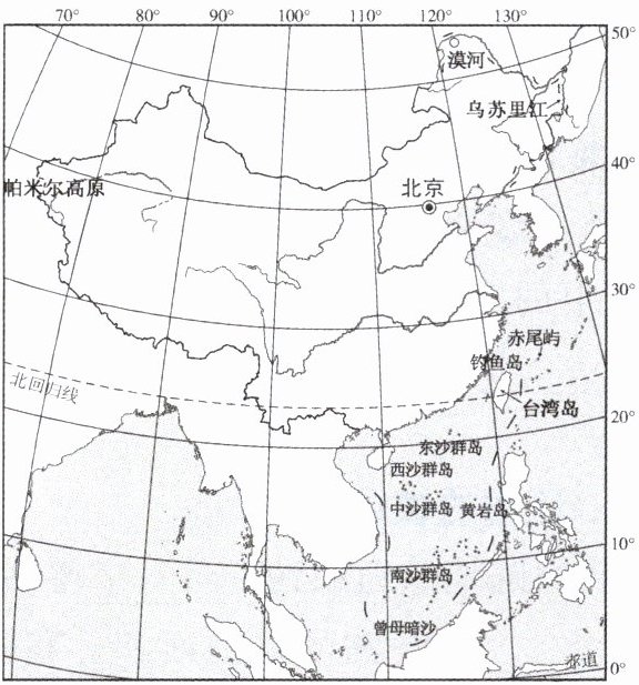 (跨学科)诗歌《我爱你中国》中写道:“当灿烂的太阳跳出了你东海的碧波,你的帕米尔高原上依然是群星闪烁。当你的北国还是银装素裹的世界啊!你的南疆早已到处洋溢着盎然的春色。”结合诗歌和下图,完成4~7题。
