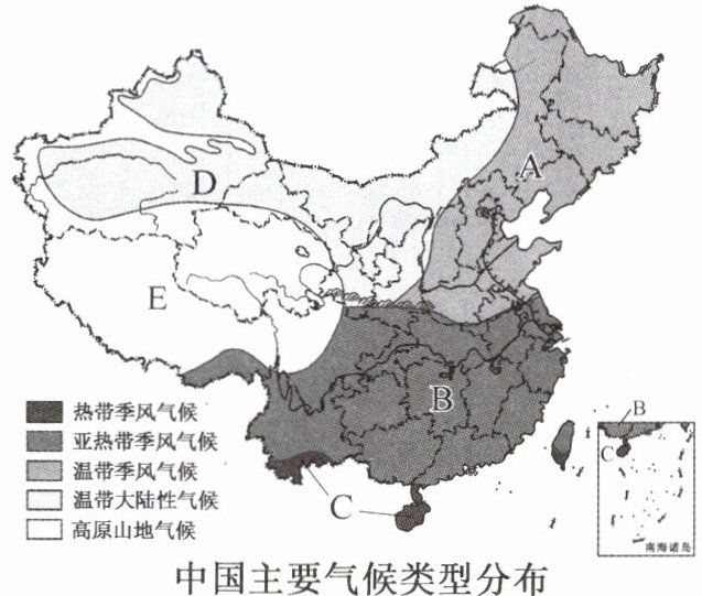 温带季风 暖热多雨 寒冷干燥 亚热带季风 高温多雨 温和少雨 热带季风 温带大陆性 高原山地