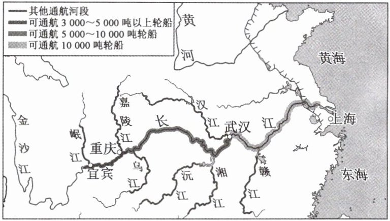 目前,长江干支流通航里程超过 7 万千米,是我国著名的“黄金水道”。读长江主要通航河段分布图,完成 4~5 题。