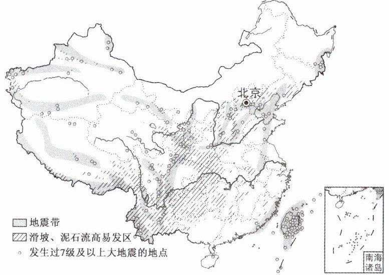 我国是自然灾害多发国家。当自然灾害来临时,采取正确的避灾措施,可以有效避免或降低灾害造成的损失。读我国主要地质灾害分布图,完成1~3题。