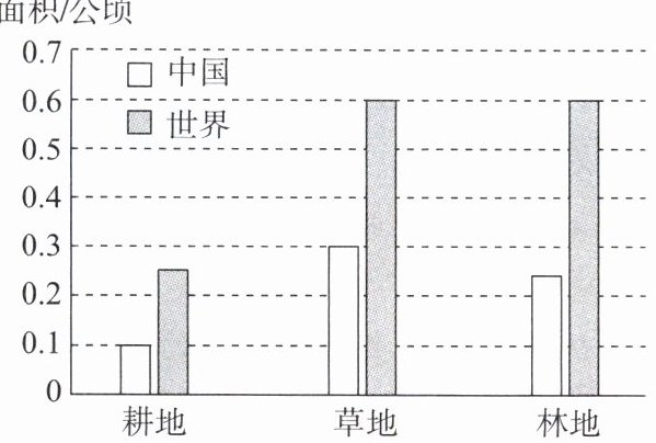 下图为我国人均耕地、草地、林地面积与世界平均水平的比较图。读图,完成 1~2 题。