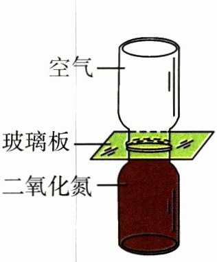 2 - 1. 如图所示,两个相同瓶子的瓶口相对,之间用一块玻璃板隔开,上面的瓶中装有空气,下面的瓶中装有密度比空气大的红棕色二氧化氮气体。抽掉玻璃板后,我们观察到红棕色气体逐渐进入上瓶,下瓶中气体颜色逐渐变淡,最后两瓶中气体颜色变得均匀。