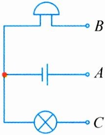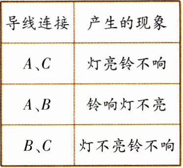 解 现象①:连接A、C时,灯亮铃不响,说明AC所在电路有灯泡和电源。现象②:连接A、B时,铃响灯不亮,说明AB所在电路有电铃和电源。现象③:连接B、C时,灯不亮铃不响,说明BC所在电路只有灯泡和电铃,没有电源。由以上分析可知:灯泡和电铃并联,A点与电源相连,B、C两点分别与电铃和灯泡相连。