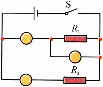 如图所示。[解析]根据电路图可知,上面的电表与R₁串联,所以它是电流表;中间的电表与灯泡R₁并联,因此为电压表;下面的电表与R₂串联,因此为电流表。