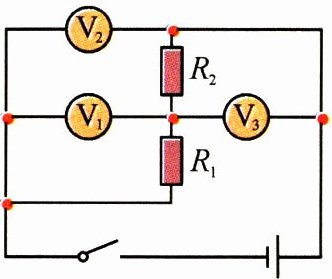 D [解析]由图知,闭合开关,电流从正极出发,经R₂、R₁回到负极,所以两只电阻串联;电压表V₂并联在电源两端,所以测量电源电压;电压表V₁并联在R₁两端,所以测量R₁两端电压;电压表V₃并联在R₂两端,所以测量R₂两端电压,选项D说法正确。
