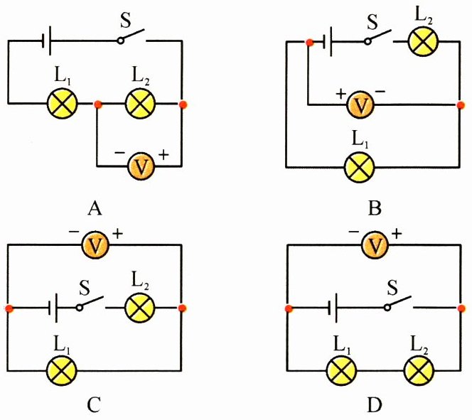 3. (知识点3·能力点2)如图所示的电路图中,能用电压表正确测出灯泡$L_1$两端电压的是(