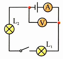 B [解析]由图可知,电流从电源的正极出来后,先后经过电流表、灯泡L₁、开关、灯泡L₂回到电源的负极,所以该段电路为串联电路,电流表测量电路中的电流,电压表并联到了电流表、灯泡L₁、开关的两端,只有B图与实物图符合,故B图正确。