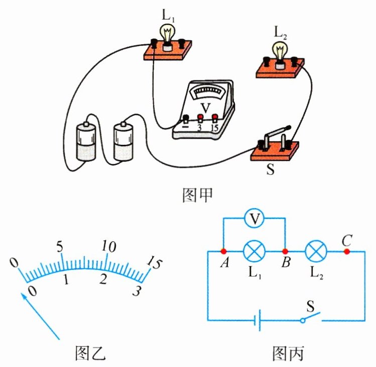 小明选用两节新电池,两个小灯泡,一个电压表来探究串联电路电压的特点。