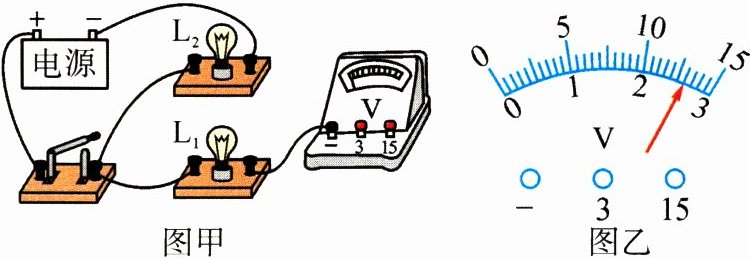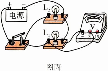 (2) 电路连接正确后进行实验,某小组分别测出小灯泡 $ L_{1} $、$ L_{2} $ 两端的电压和并联电路的总电压,电压表示数相同,如图乙所示,其值为______V。根据这组数据,该小组得出并联电路中电压的规律。你认为实验的疏漏之处是______。纠正后得到并联电路中的电压规律为______。