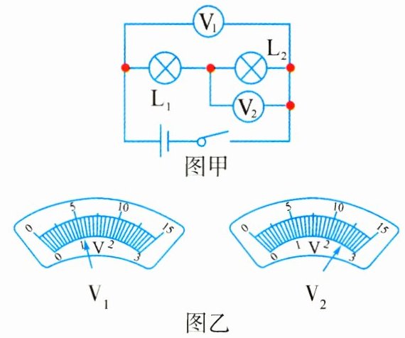 如图甲所示的电路中,电压表所用的量程不明,当电路闭合后,电压表 $ V_{1} $ 和 $ V_{2} $ 的示数如图乙所示,则电压表 $ V_{1} $ 用的量程是______V,电压表 $ V_{2} $ 用的量程是______V,小灯泡 $ L_{1} $ 两端的电压 $ U_{1} $ 为______。