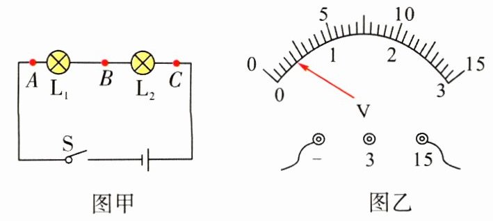 (2) 闭合开关后,小明发现两灯都不发光,于是分别把电压表接在图甲中 A、B 两点,B、C 两点及 A、C 两点,测得数据分别是 $ U_{AB} = 3 $ V,$ U_{BC} = 0 $ V,$ U_{AC} = 3 $ V;小明检查发现只有灯 $ L_{1} $ 和灯 $ L_{2} $ 中的一盏出现故障,则故障可能是