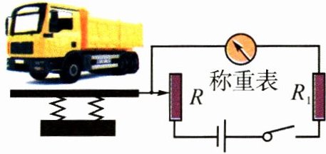 D 【解析】称重表与电阻串联,应为电流表,故A错误;当物体很重时,滑片滑到最下端,如果没有电阻R₁,会造成电源短路,烧坏电源和称重表,因此电路中的R₁具有保护称重表的作用,故B错误;当车辆越重时,滑片向下滑,R连入电路的阻值越小,电路的总电阻越小,对电流的阻碍作用越小,电路的电流越大,称重表的示数越大,故C错误、D正确。