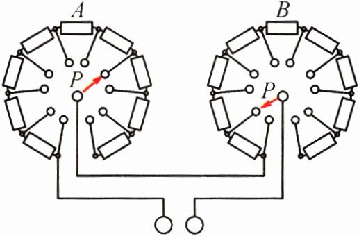 8. (知识点3·能力点2)如图为某电阻箱的内部结构示意图。调节旋钮$A$、$B$,可以使滑片$P$分别与各触点接通(小圆圈表示触点),$A中每个电阻均为1\Omega$,$B中每个电阻均为10\Omega$,当两个旋钮调节至图示位置时,电阻箱的总电阻为______$\Omega$,若用这个电阻箱调节扬声器的音量,应该将其与扬声器______联。某次使用时,需要对扬声器音量进行微调,则应该调节旋钮______(填“$A$”或“$B$”)。