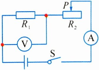 解 电路图中 $R_{1}$ 和 $R_{2}$ 串联,电压表测 $R_{1}$ 两端电压,电流表测串联电路中的电流。当滑片 $P$ 向右滑动时,滑动变阻器接入电路的阻值变大,D 错误;电路中的总电阻变大,A 错误;对电流的阻碍作用变大,电路中的电流变小,电流表示数变小,B 正确,C 错误。