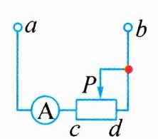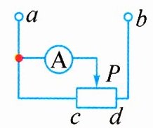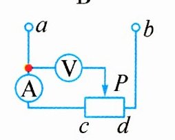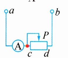解 选项 A、C 中,滑动变阻器连入的是 $Pd$ 段电阻丝,滑片向 $d$ 端移动时,电路中电阻变小,电流会变大。选项 B 中,滑动变阻器连入的是 $cP$ 段电阻丝,滑片向 $d$ 端移动时,电路中电阻变大,电流会变小。选项 D 中,滑动变阻器连入的是 $cd$ 段电阻丝,滑片的移动不能改变电路中的电阻,因而不能改变电路中的电流,但电压表的示数会发生改变。