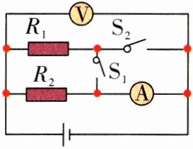 1. 如图所示的电路中,电源电压恒定不变,已知$R_{1}= 3R_{2}$。当$S_{1}$闭合、$S_{2}$断开时,电压表示数为$3V$,电流表示数为$0.4A$,电阻$R_{1}$为