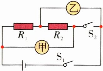 由电路图可知,当开关$S_{1}$、$S_{2}$闭合,甲、乙两表为电压表时,两电阻串联,甲测电源的电压,乙测$R_{2}$两端的电压,由串联电路电流相等和$I= \frac{U}{R}可得\frac{U_{甲}}{R_{1}+R_{2}}= \frac{U_{乙}}{R_{2}}$,则$\frac{R_{1}}{R_{2}}= \frac{U_{甲}-U_{乙}}{U_{乙}}= \frac{5 - 1}{1}= \frac{4}{1}$,所以$R_{1}= 4R_{2}$;当$S_{1}$闭合、$S_{2}$断开,甲、乙两表为电流表时,两电阻并联,甲测$R_{2}$支路的电流,乙测干路电流,由并联电路中各支路两端的电压相等和$I= \frac{U}{R}$可得,两电流表的示数之比$\frac{I_{甲}}{I_{乙}}= \frac{\frac{U}{R_{2}}}{\frac{U}{R_{1}}+\frac{U}{R_{2}}}= \frac{R_{1}}{R_{1}+R_{2}}= \frac{4R_{2}}{4R_{2}+R_{2}}= \frac{4}{5}$。