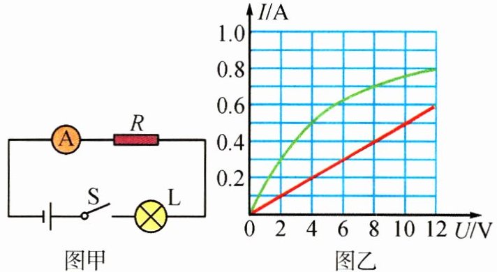 C 【解析】电阻R为定值,故电流随电压的变化关系为一直线,根据图像,由$I=\frac{U}{R}$可得,电阻R的阻值:$R=\frac{U}{I}=\frac{12\ {V}}{0.6\ {A}}=20\ \Omega$;由电路图可知,电阻R和灯泡L串联,电流表测电路中的电流,串联电路中各处的电流相等,由图像可知,电流$I=0.3\ {A}$时,$U_{L}=2\ {V}$,$U_{R}=6\ {V}$,则电源电压:$U=U_{L}+U_{R}=2\ {V}+6\ {V}=8\ {V}$。
