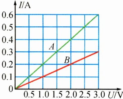 0.4 3 【解析】由题图可知,二者并联后接入电路中,当通过电阻B的电流是0.2 A时,B两端的电压是2.0 V,并联电路各支路两端电压相等,所以A两端的电压也是2.0 V,由题图可知,此时通过电阻A的电流是0.4 A;由题图可知,二者串联后接入电路中,当通过电阻A的电流是0.3 A时,串联电路电流处处相等,所以通过B的电流也是0.3 A,由题图可知,此时电阻B两端的电压是3.0 V。