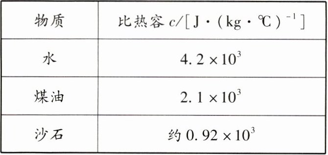 D 【解析】比热容是物质的一种特性,与质量无关,一杯水倒出一半,杯内剩余水的比热容不变,故A错误;由Δt=Qₑₓ/c m可知,物体降低的温度还与质量有关,未知质量关系不能比较降低的温度,故B错误;水的比热容为4.2×10³J/(kg·℃),表示质量1kg的水温度升高1℃吸收的热量是4.2×10³J,故C错误;由Qₐₙ=cmΔt可知,水和煤油的质量、吸收热量相等时,由于煤油的比热容小,温度升高得较多,故D正确。