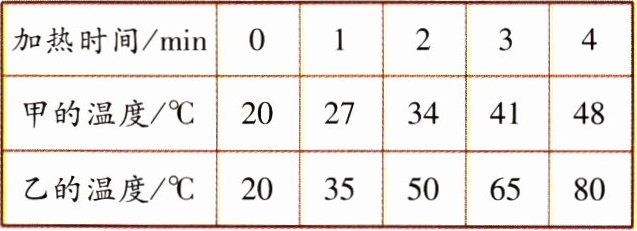 (3)分析实验数据可知,因为加热时间代表吸热的多少,所以此实验是通过比较温度的变化来判断吸热能力强弱的;由实验数据知,在吸收相等的热量时,甲温度升高得较小根据 $ Q = cm\Delta t $ 可知,甲液体吸热本领强,即比热容大。