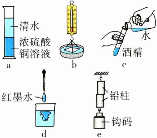 图 c:水和酒精充分混合后的总体积小于混合前水和酒精的总体积;