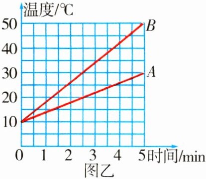 (3) 根据实验数据绘制的温度与时间的关系图像如图乙所示,分析图像可知:质量相等的 $A$ 和 $B$ 两种液体,在升高相同温度时,