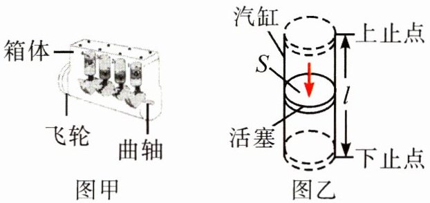 (2) 有一台四缸发动机,其主要技术指标如表所示。图乙为发动机做功冲程的示意图,其中排量等于四个汽缸工作容积的总和,汽缸工作容积指活塞从上止点到下止点所扫过的容积,又称单缸排量,它取决于活塞的面积和活塞上下运动的距离(即冲程长)。转速表示每分钟曲轴或飞轮所转的周数。该发动机在 1 s 内做功______ J,单缸排量 $ V = $______ L。