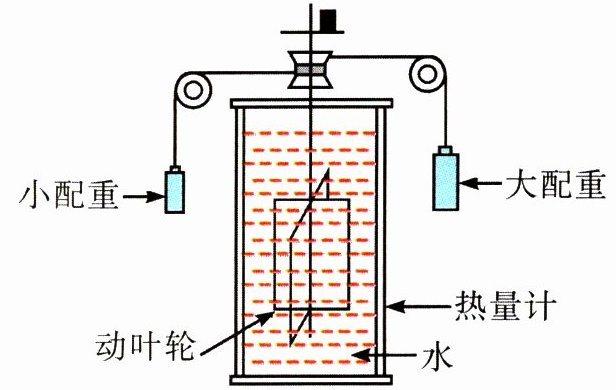 9. (2021·佛山月考·知识点1、2)如图所示,这是物理学家焦耳设计并制作的实验装置。装置中的两个配重重力不等,释放后大配重下降,小配重上升;通过反复对调左右两个配重,会使动叶轮不停地转动,从而导致热量计中水的温度上升,实现能量转化。实验中科学家某次测得数据如下:小配重重力$G_{小}= 100N$,大配重重力$G_{大}= 520N$,每升降一次配重各自移动的距离$h= 1m$,热量计中水的质量$m= 500g$,升降次数与水温变化的关系如表所示: